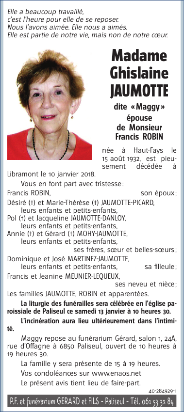 Fallecida en Libramont (6800) el miércoles, 10 de enero de 2018 a la edad de 85 años
