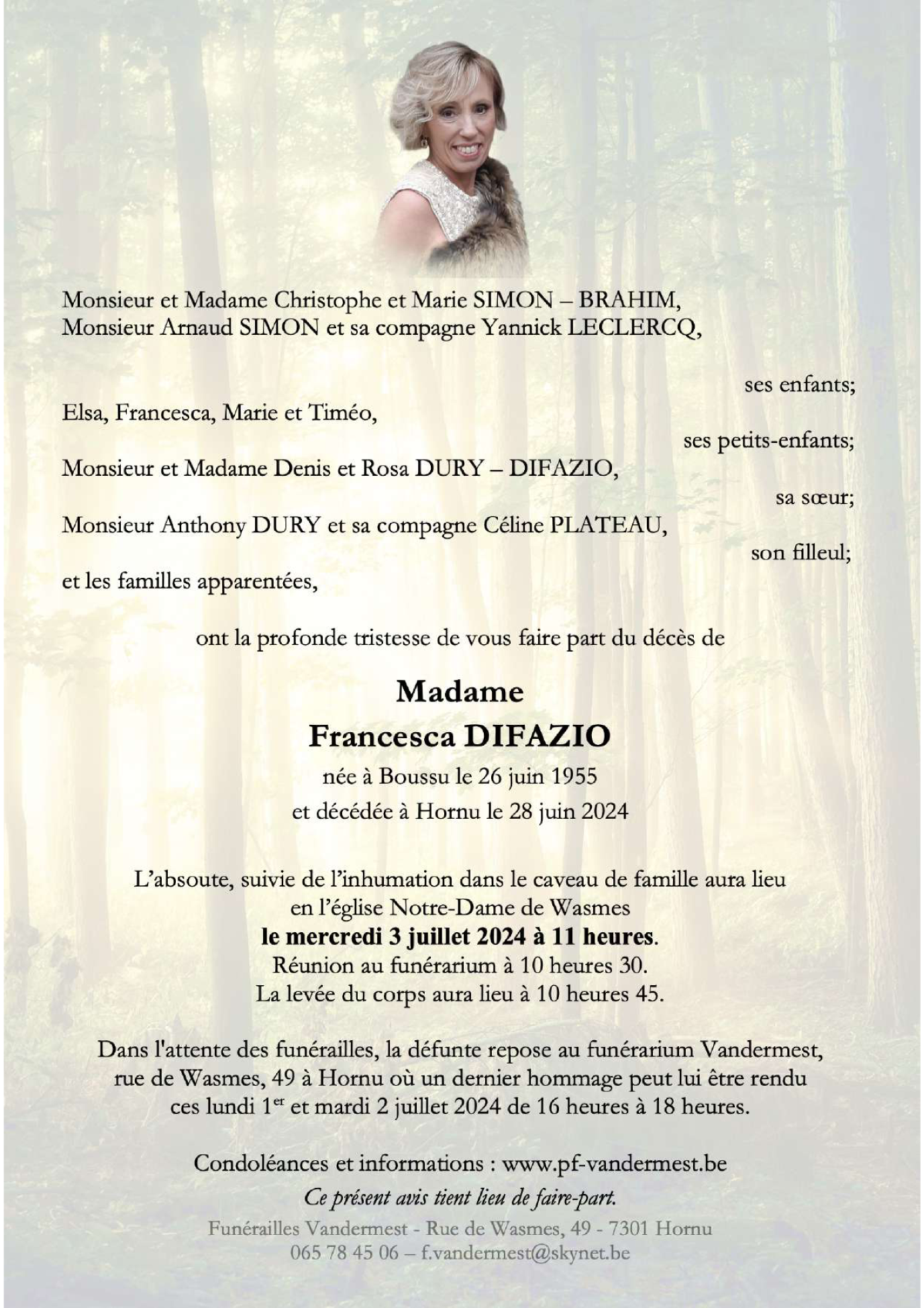 Décédée à Hornu (7301) le vendredi 28 juin 2024 à l'âge de 69 ans