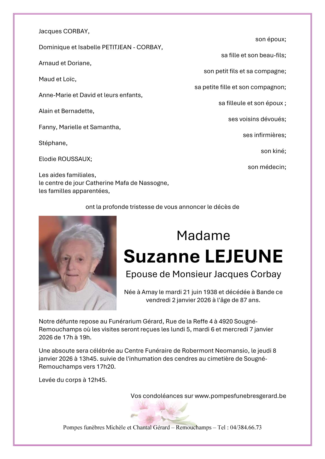 Décédée à Bande (6951) le vendredi 2 janvier 2026 à l'âge de 87 ans