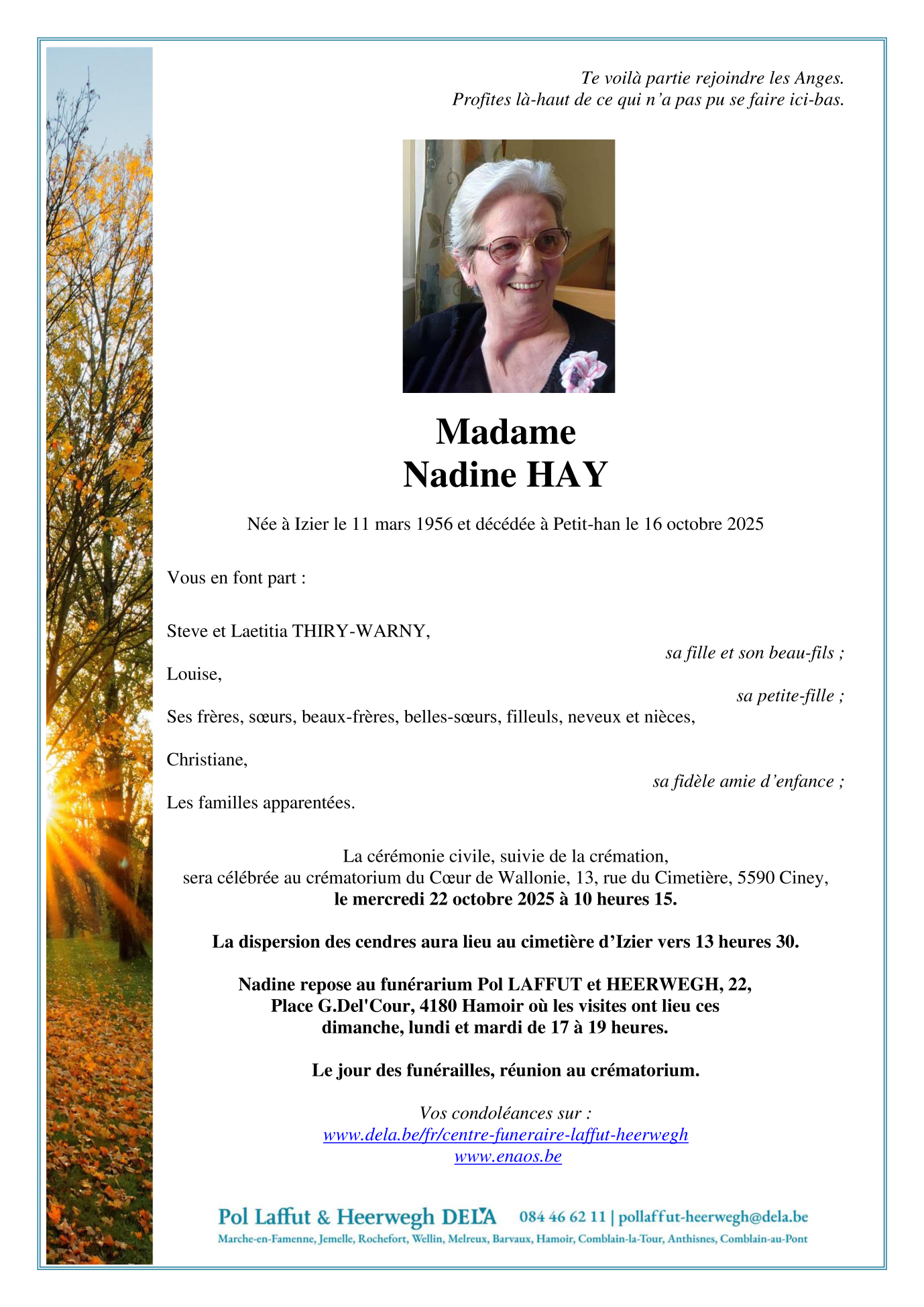 Fallecida en Petit-Han (6940) el jueves, 16 de octubre de 2025 a la edad de 69 años