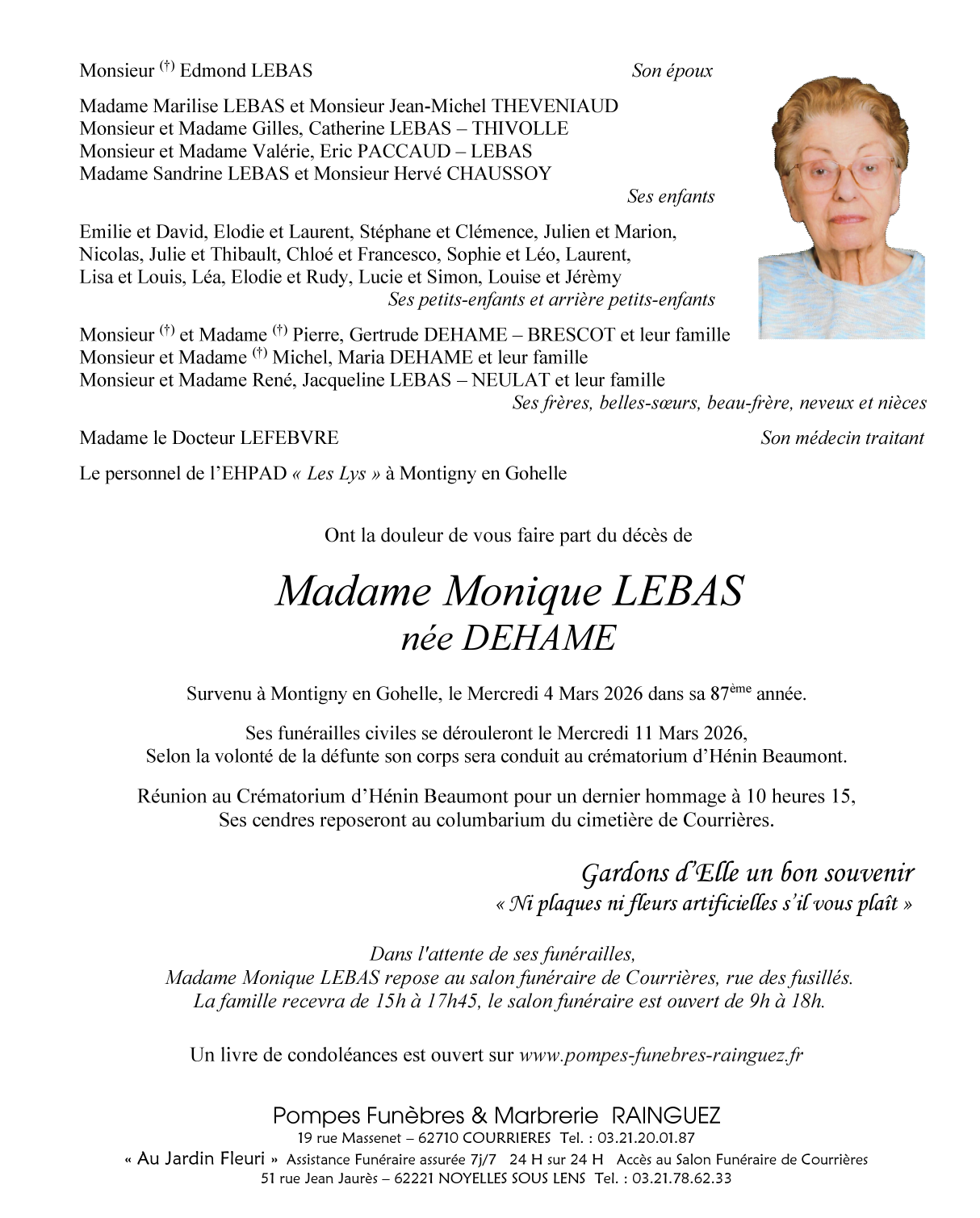 Madame Monique LEBAS née DEHAM