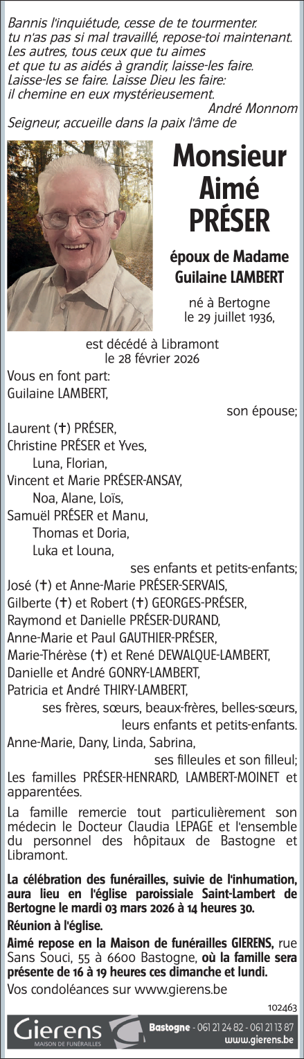 Décédé à Libramont-Chevigny (6800) le samedi 28 février 2026 à l'âge de 89 ans