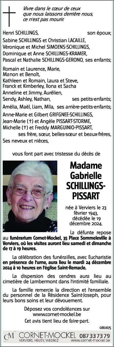 Fallecida en Verviers (4800) el jueves, 19 de diciembre de 2024 a la edad de 81 años