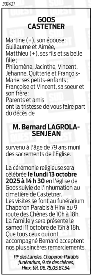 Widower of Madame Martine LAGROLA-SENJEAN