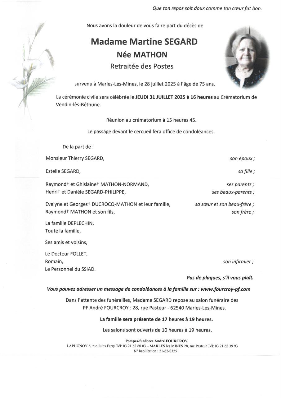 Décédée à Marles-les-Mines (62540, France) le lundi 28 juillet 2025 à l'âge de 75 ans