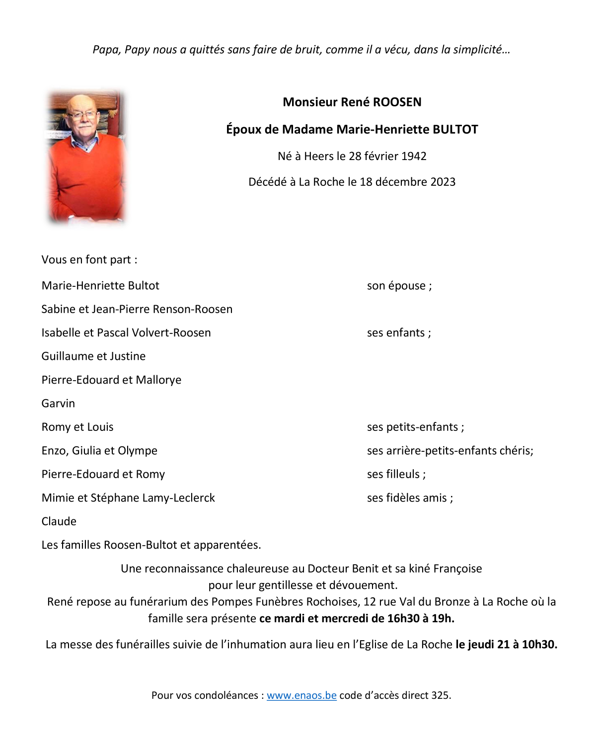 Died in La Roche-en-Ardenne (6980) on 18 December 2023 at the age of 81 years