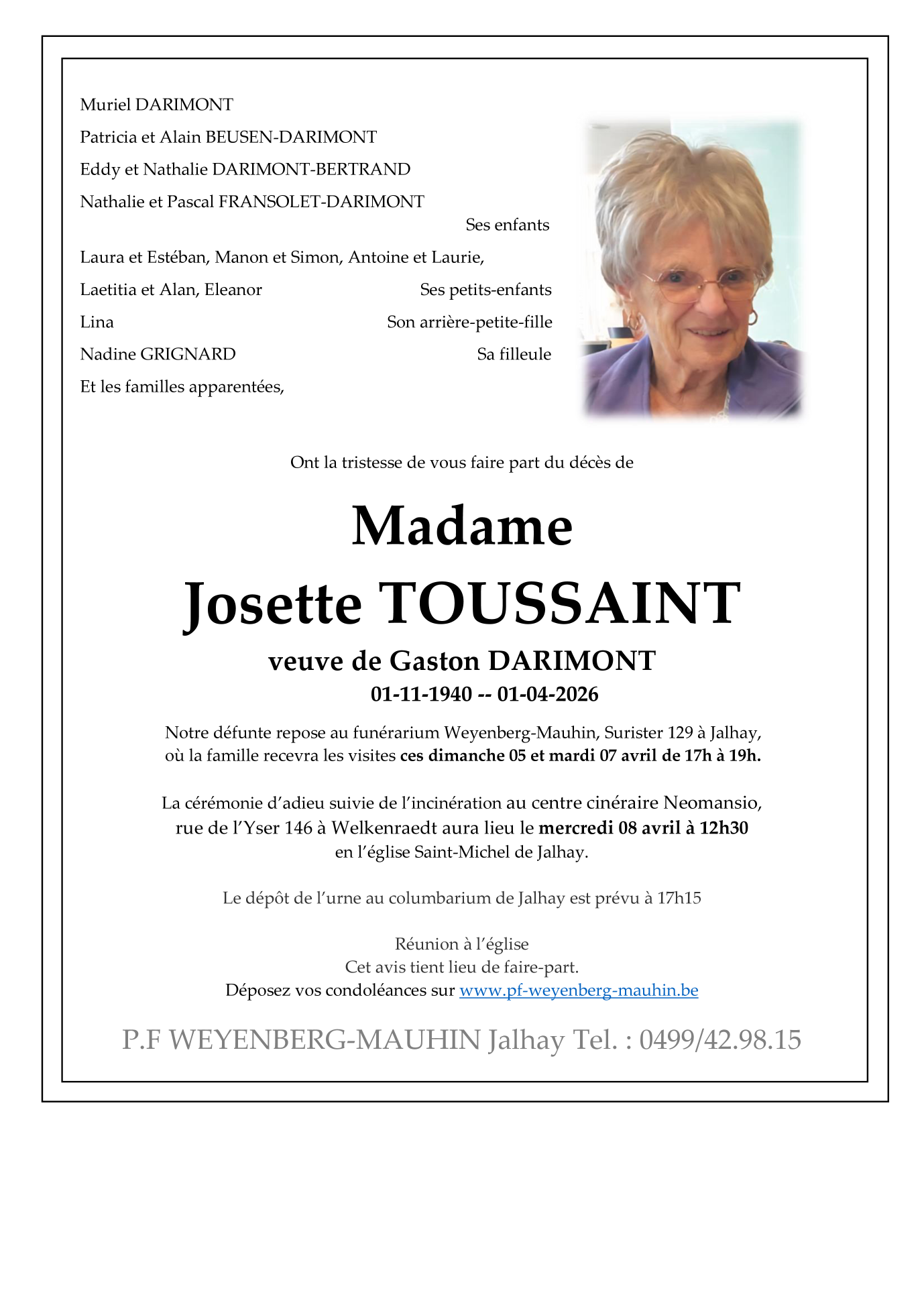 Décédée à Verviers (4800) le mercredi 1 avril 2026 à l'âge de 85 ans