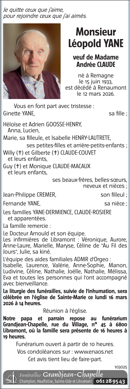 Décédé à Renaumont (6800) le jeudi 12 mars 2026 à l'âge de 92 ans