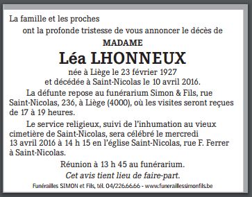 Décédée à Saint-Nicolas (Lg.) (4420) le dimanche 10 avril 2016 à l'âge de 89 ans