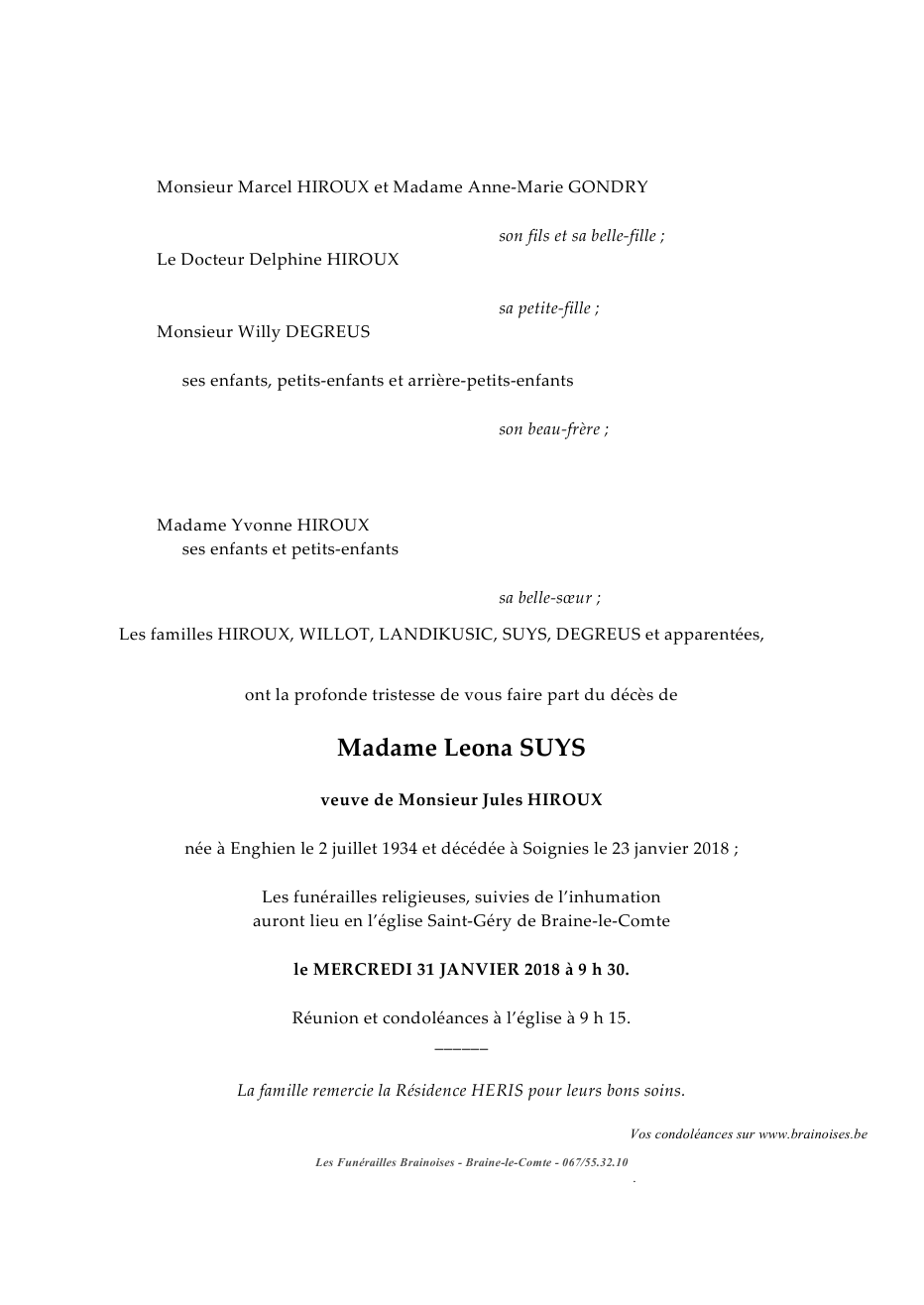 Décédée à Soignies (7060) le mardi 23 janvier 2018 à l'âge de 83 ans