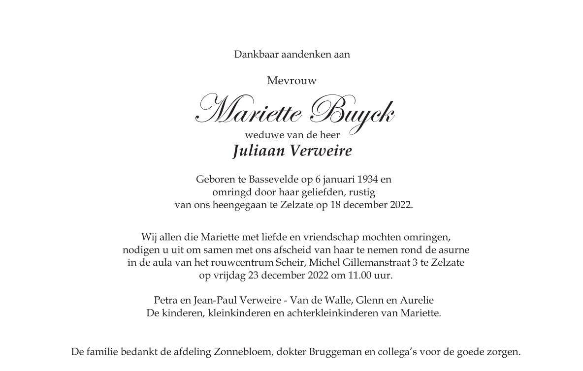 Décédée à Zelzate (9060) le dimanche 18 décembre 2022 à l'âge de 88 ans
