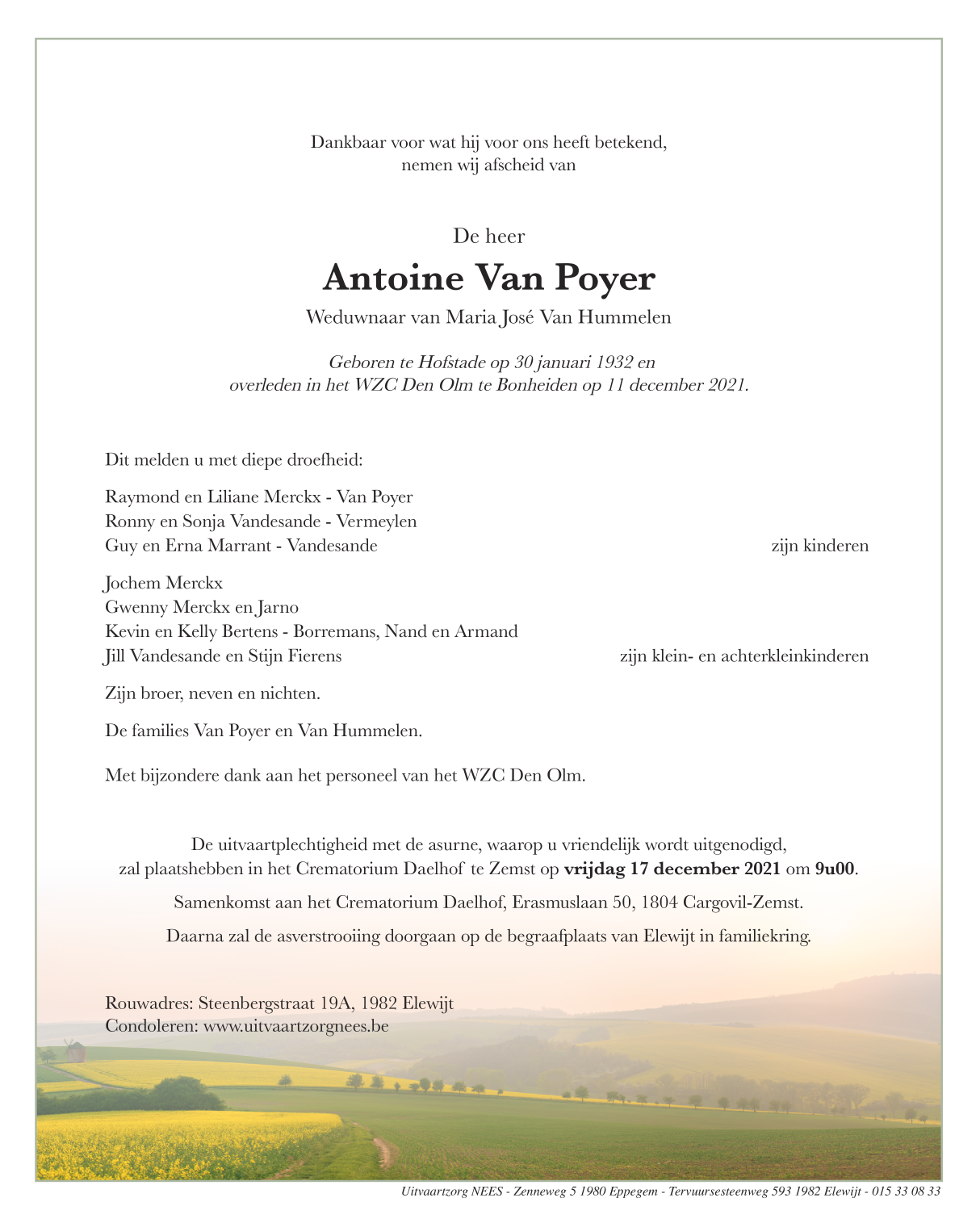 Décédé à Bonheiden (2820) le samedi 11 décembre 2021 à l'âge de 89 ans