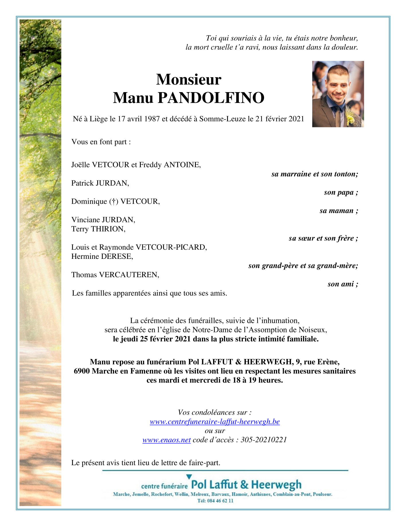 Décédé à Somme-Leuze (5377) le dimanche 21 février 2021 à l'âge de 33 ans
