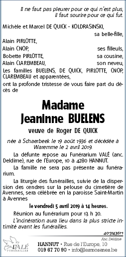Décédée à Waremme (4300) le mardi 2 avril 2019 à l'âge de 82 ans
