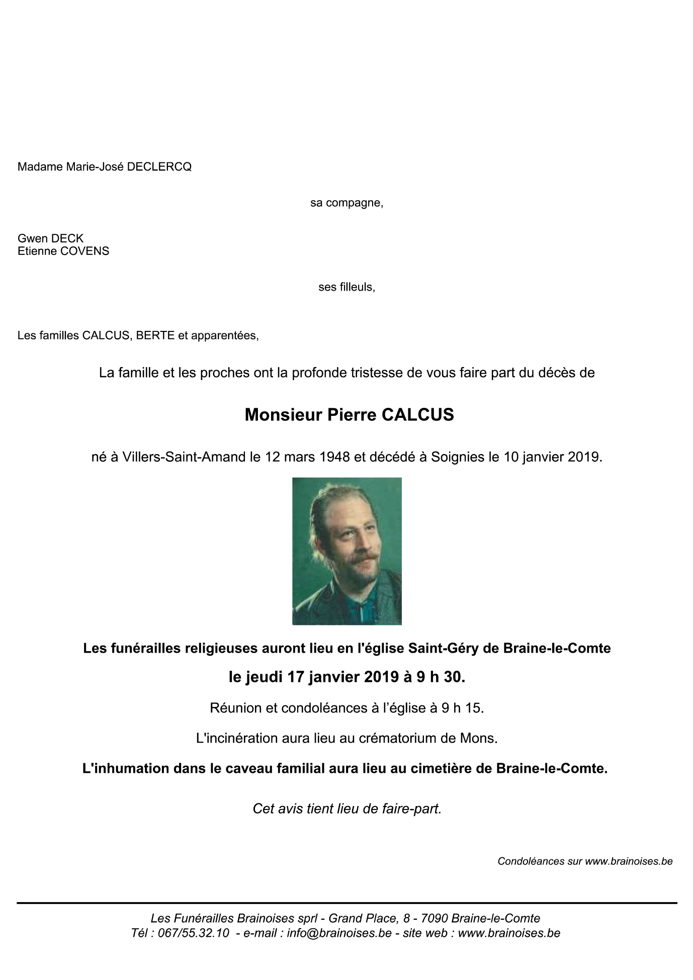 Décédé à Soignies (7060) le jeudi 10 janvier 2019 à l'âge de 70 ans