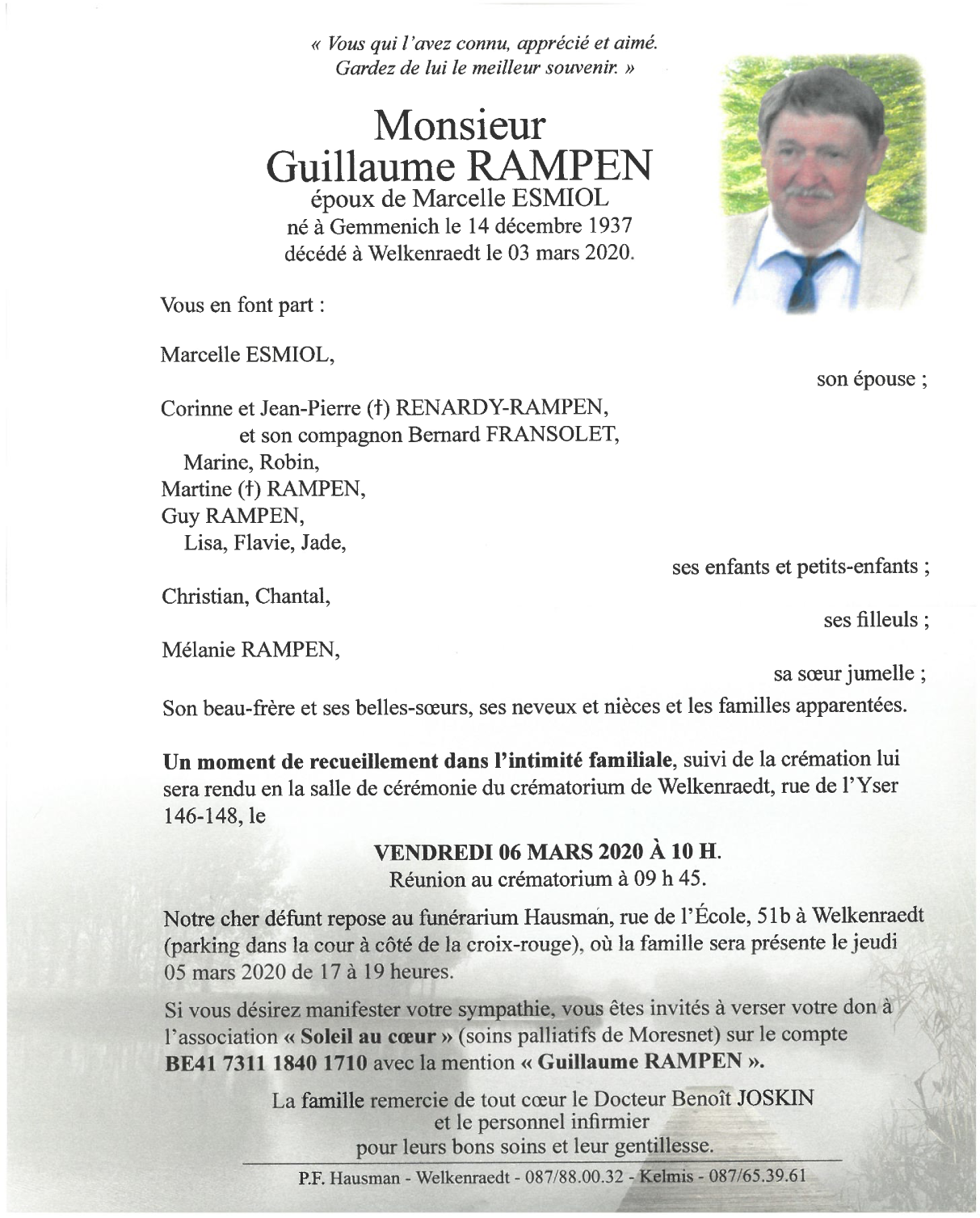 Décédé à Welkenraedt (4840) le mardi 3 mars 2020 à l'âge de 82 ans