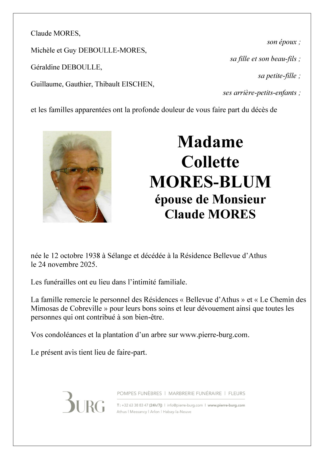 Fallecida en Athus (6791) el lunes, 24 de noviembre de 2025 a la edad de 87 años