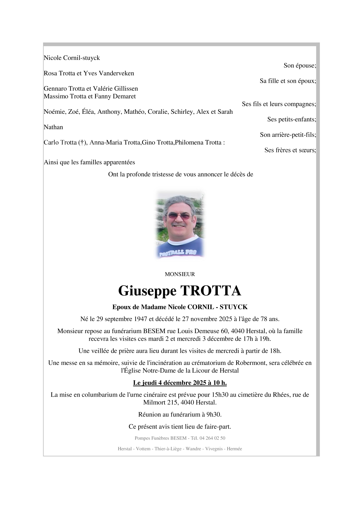 Décédé à Liège (4000) le jeudi 27 novembre 2025 à l'âge de 78 ans