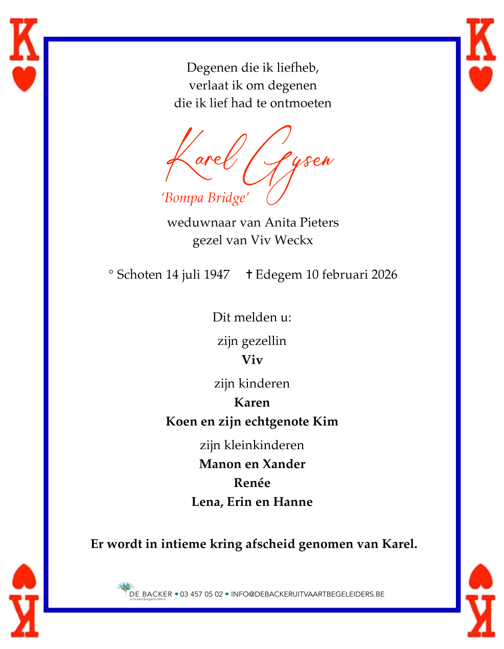 Died in Edegem (2650) on 10 February 2026 at the age of 78 years