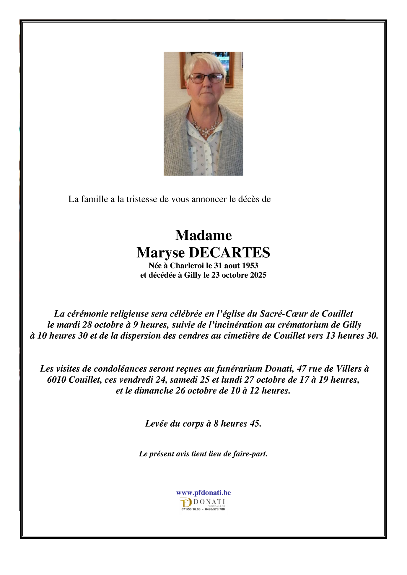 Décédée à Gilly (6060) le jeudi 23 octobre 2025 à l'âge de 72 ans