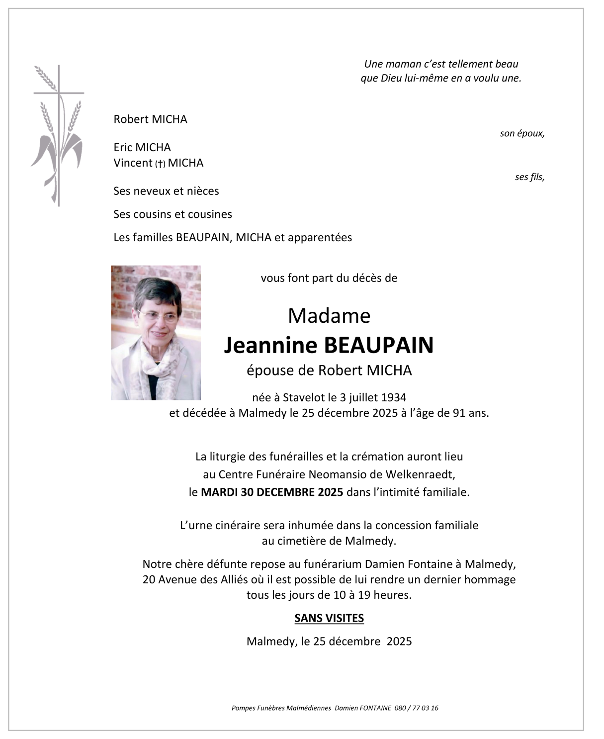 Décédée à Malmedy (4960) le jeudi 25 décembre 2025 à l'âge de 91 ans