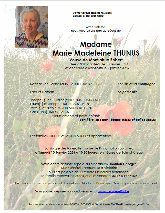 Décédée à Saint-Vith (4780) le mercredi 7 janvier 2026 à l'âge de 81 ans