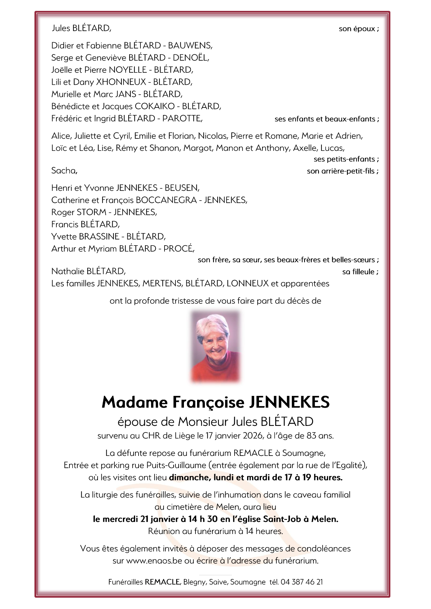 Décédée à Liège (4000) le samedi 17 janvier 2026 à l'âge de 83 ans