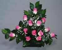 Jardinière de fleurs en tergal, roses roses et gypsophiles. 40 x 45 cm
