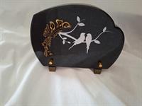 | Plaque coeur 2 inters lithogravure Plaque en granit en forme de cœur avec un socle rectangulaire en marbre.