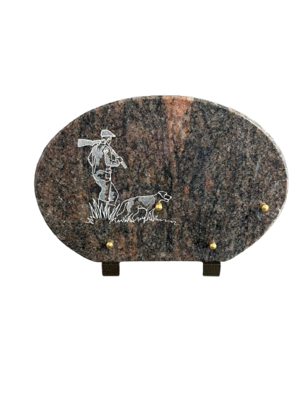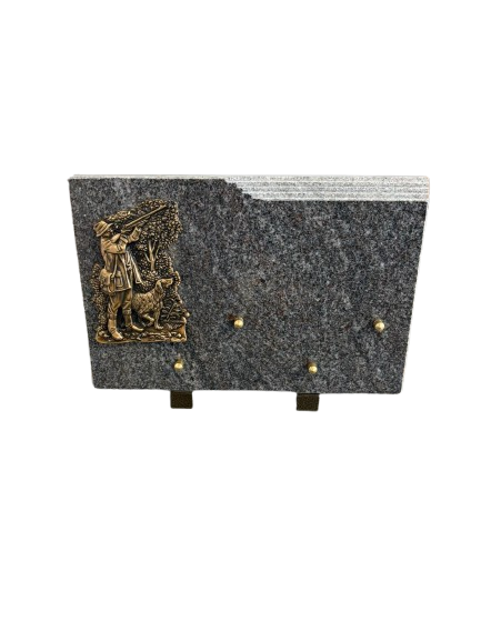 | Plaque funéraire " chasseur " Plaque funéraire en granit sur embase métallique