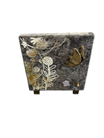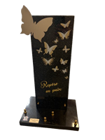 | Plaque funéraire "papillon " Plaque funéraire granit noir sur embase avec motif papillon miroir