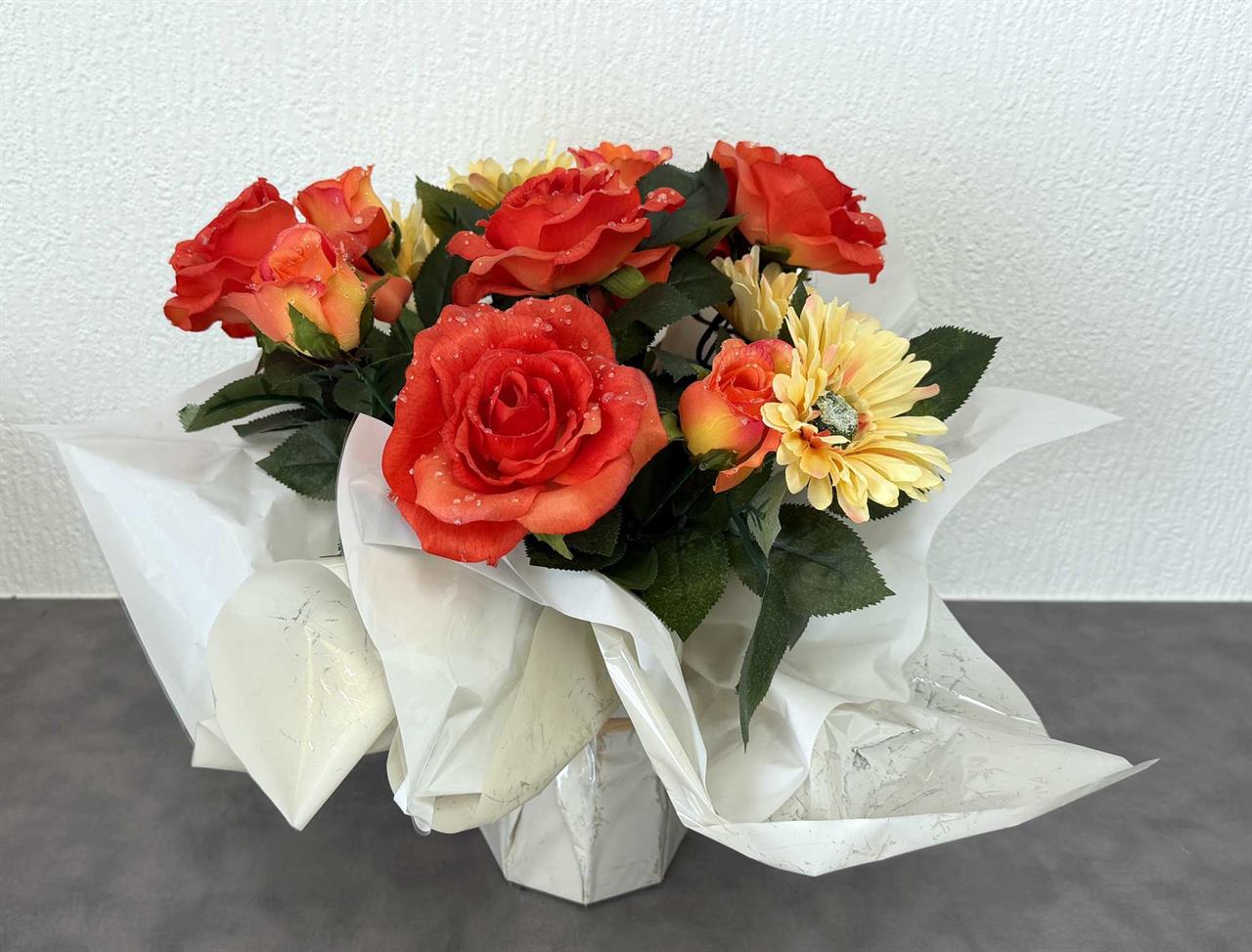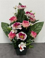 Composition de fleurs tergal dans un pot lesté avec des roses et orchidées. Dim : 42cm de hauteur : 40cm de large. ATTENTION : COMMANDE AU PLUS TARD LE SAMEDI JUSQU'A MIDI POUR LES OBSEQUES QUI ONT LIEU LE LUNDI. Nos articles en ligne sont exclusivement disponibles pour les funérailles que nous organisons. Aucun envoi par colis n'est proposé.
