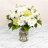 Bouquet rond de fleurs de saison dans les tons de blanc et vert, avec bulle d'eau - Diamètre 30 cm