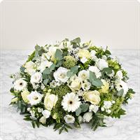 Raquette de fleurs de saison dans les tons blancs et agrémentée d'un généreux feuillage - Env. 70 / 75 cm - Ruban inclus avec 50 caractères max -