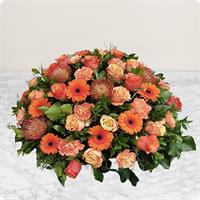 Eclatant coussin rond de fleurs de saison colorées agrémentées d'un délicat feuillage - Env. 55 cm - Ruban inclus avec 50 caractères max -