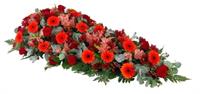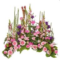 Eclatant dessus de cercueil avec fleurs de saison colorées - Env. 150 cm - Ruban inclus avec 50 caractères max -