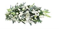 Dessus de cercueil avec fleurs de saison dans les tons blancs et agrémentée d'un généreux feuillage - Env. 150 cm - Ruban inclus avec 50 caractères max -