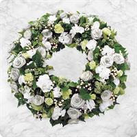 Couronne de fleurs de saison dans les tons blancs et agrémentée d'un généreux feuillage - Env. 60 cm - Ruban inclus avec 50 caractères max -