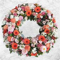 Eclatante raquette de fleurs de saison colorées - Env. 70 / 75 cm - Ruban inclus avec 50 caractères max -