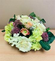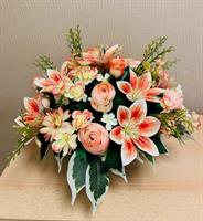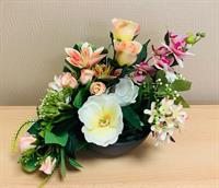 Coupe en plastique lesté pour éviter la prise au vent dans les tons saumons (roses hortensias et orchidées) Hauteur 40 cm Largeur 40 cm