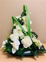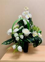 Bouquet lesté pour éviter la prise au vent dans les tons blanc ( rose et orchidées) composition pouvant être mise dans un vase. Hauteur: 60cm