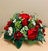 Bouquet lesté pour éviter la prise au vent ( roses, lys et orchidées) pouvant être mis dans un vase. Hauteur 70 cm