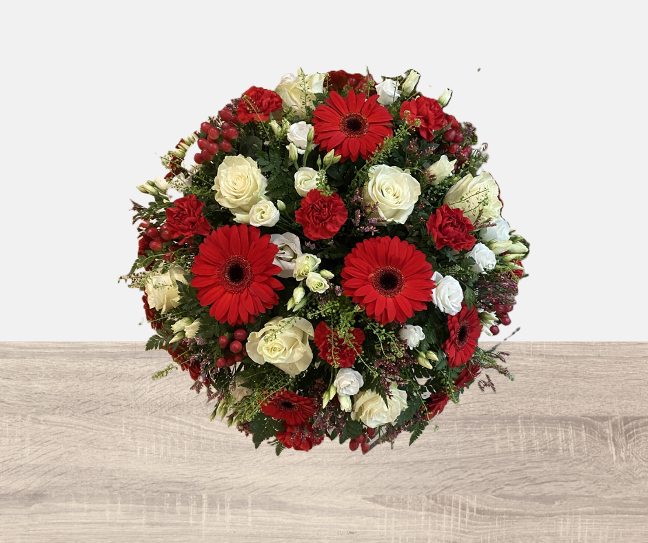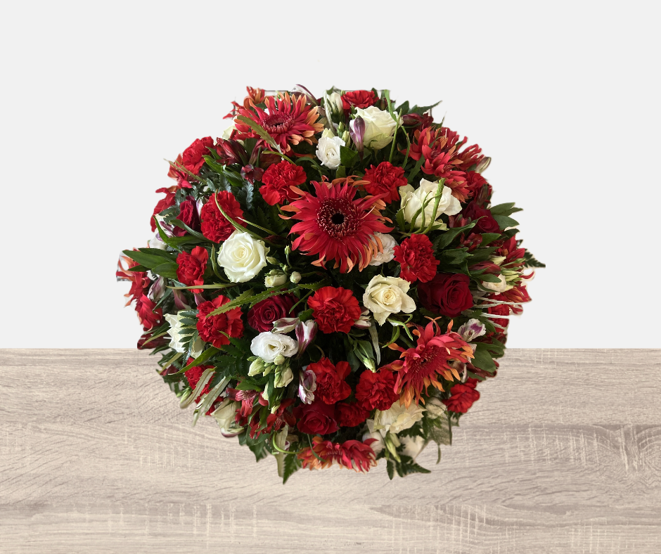 Fleurs fraîches. Grand dessus de cercueil avec des fleurs rouge et blanche. (Fleurs de saison)