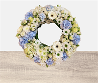 Fleurs fraîches. Couronne de fleurs bleu et blanche. (Fleurs de saison)