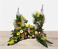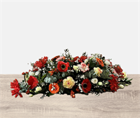 Fleurs fraîches. Dessus de cercueil avec des fleurs rouge et orange. (Fleurs de saison)