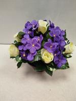 | Potée de fleurs artificielles Potée mélange de violettes et roses jaunes.