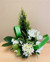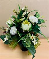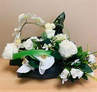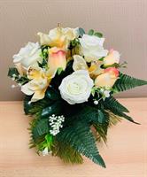 Bouquet de fleurs artificielles lesté pour éviter la prise au vent Fleurs blanches roses, orchidées, Hortensias (pouvant être mis dans un vase) Hauteur 60 cm Largeur 40 cm