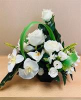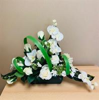 Bouquet lesté pour éviter la prise au vent dans les tons blanc ( rose et orchidées) composition pouvant être mise dans un vase. Hauteur: 60cm