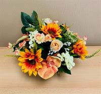 Coupe en plastique lesté pour éviter la prise au vent dans les tons saumons (roses hortensias et orchidées) Hauteur 40 cm Largeur 40 cm