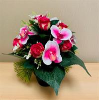 Bouquet lesté pour éviter la prise au vent ( roses, lys et orchidées) pouvant être mis dans un vase. Hauteur 70 cm